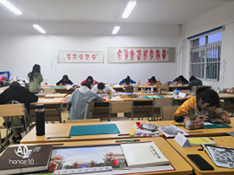 在方老师的讲解下,同学们迫不及待地想要一展身手,老师讲课结束后,同学们纷纷动起手来,一时间刻刀翻飞、纸屑纷落,老师在查看同学们自主创作的过程中进行悉心教导,并指出各自作品中需要改正的地方。一会功夫,一张张单色的剪纸变成了鲜活的作品。