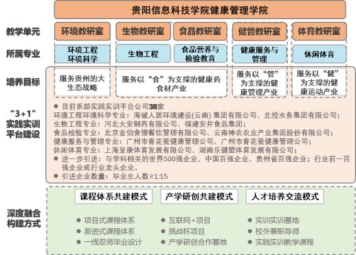 学院紧扣贵州“大健康”与“大生态”战略需求,构建差异化专业服务体系:健康服务与管理聚焦“管”,支撑健康管理产业;休闲体育聚焦“健”,服务健康运动产业;生物工程、食品营养与检验教育聚焦“食”,助力健康药食材产业;环境工程与环境科学则服务于大生态战略。