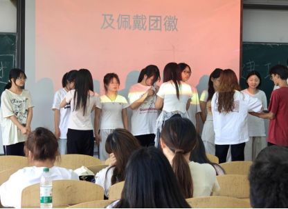 随后,宋煜老师宣读新团员名单,每一个名字的宣读都承载着一份荣誉与责任。宣读完毕,老团员们庄重地为新团员佩戴团徽。闪耀的团徽佩戴在胸前,不仅是一种身份的象征,更意味着新团员们从此肩负起共青团员的使命与担当。