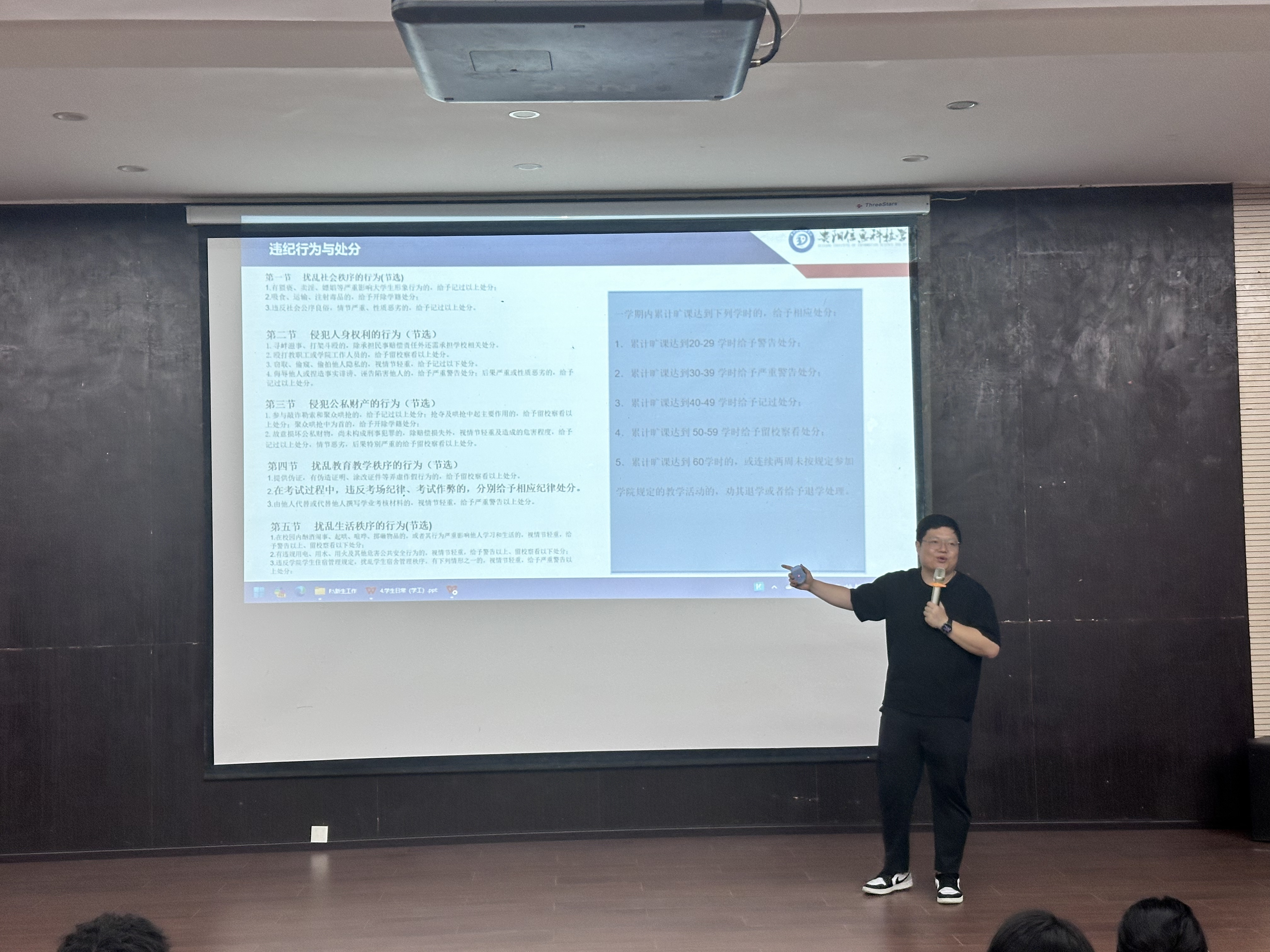 学业是大学的核心,规划是成长的前提。在随后的学业指导环节,学工办主任郭东越老师围绕《学生日常(学工)》《beat365在线唯一官网全日制本科生学士学位授予实施办法》等内容展开专题讲解。他从学生日常管理规范、严格的学业考核要求,到清晰的学士学位授予条件,逐一为新生们厘清大学学业的“边界”与“路径”,让新生们明确了大学学习的目标与方向,为后续投入专业学习做好了充分的认知准备。