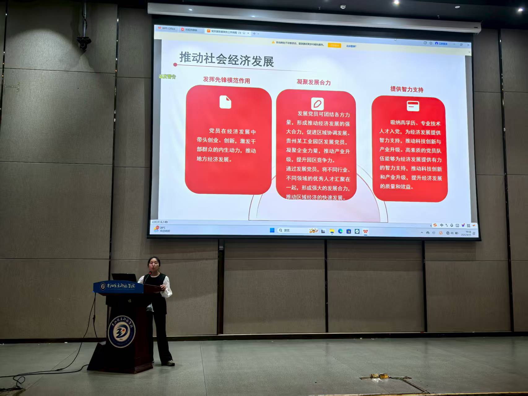 信仰是青春的灯塔,入党是许多新生的成长追求。在新生入学教育的党员发展专题讲解中,负责学院党建工作的李飞老师从入党申请的基本条件、党员发展的规范流程,到思想考核的核心标准等方面,为有入党意愿的新生们厘清了大学期间追求入党的“门槛”与“方向”,鼓励大家以高标准要求自己,在思想上、行动上向党组织靠拢,让青春在信仰的指引下更有力量。