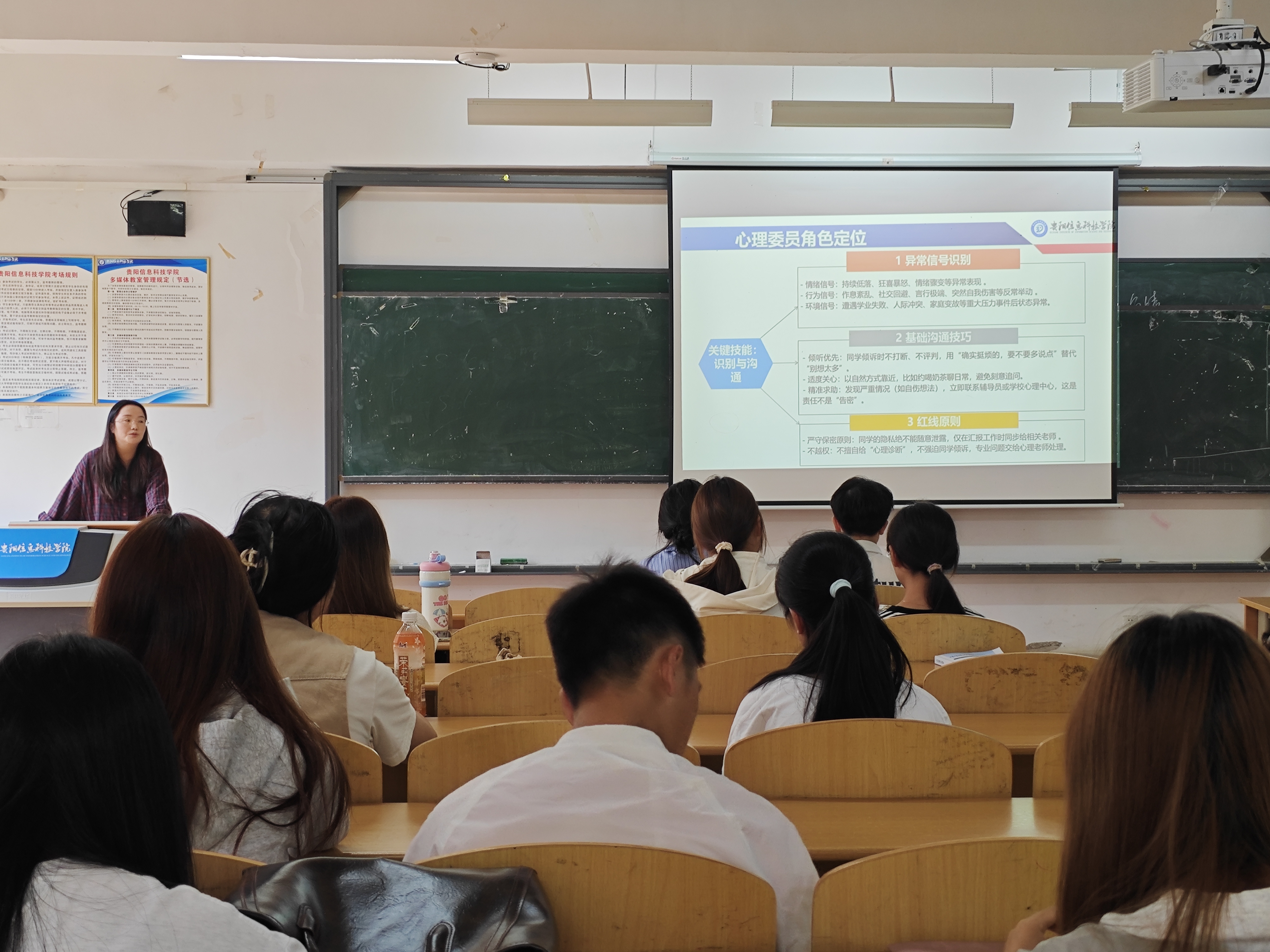 在日常事务板块,培训会对心理委员的工作进行了细化部署。重点落实“心理晴雨表”填报制度,从班级氛围、普遍困惑及重点关注对象等方面详细讲解了填写规范和班级问题反馈机制,并对日常工作开展提出要求,各心理委员需联动安全委员走访宿舍,每学期组织一次心理团辅活动,增强班级凝聚力。
