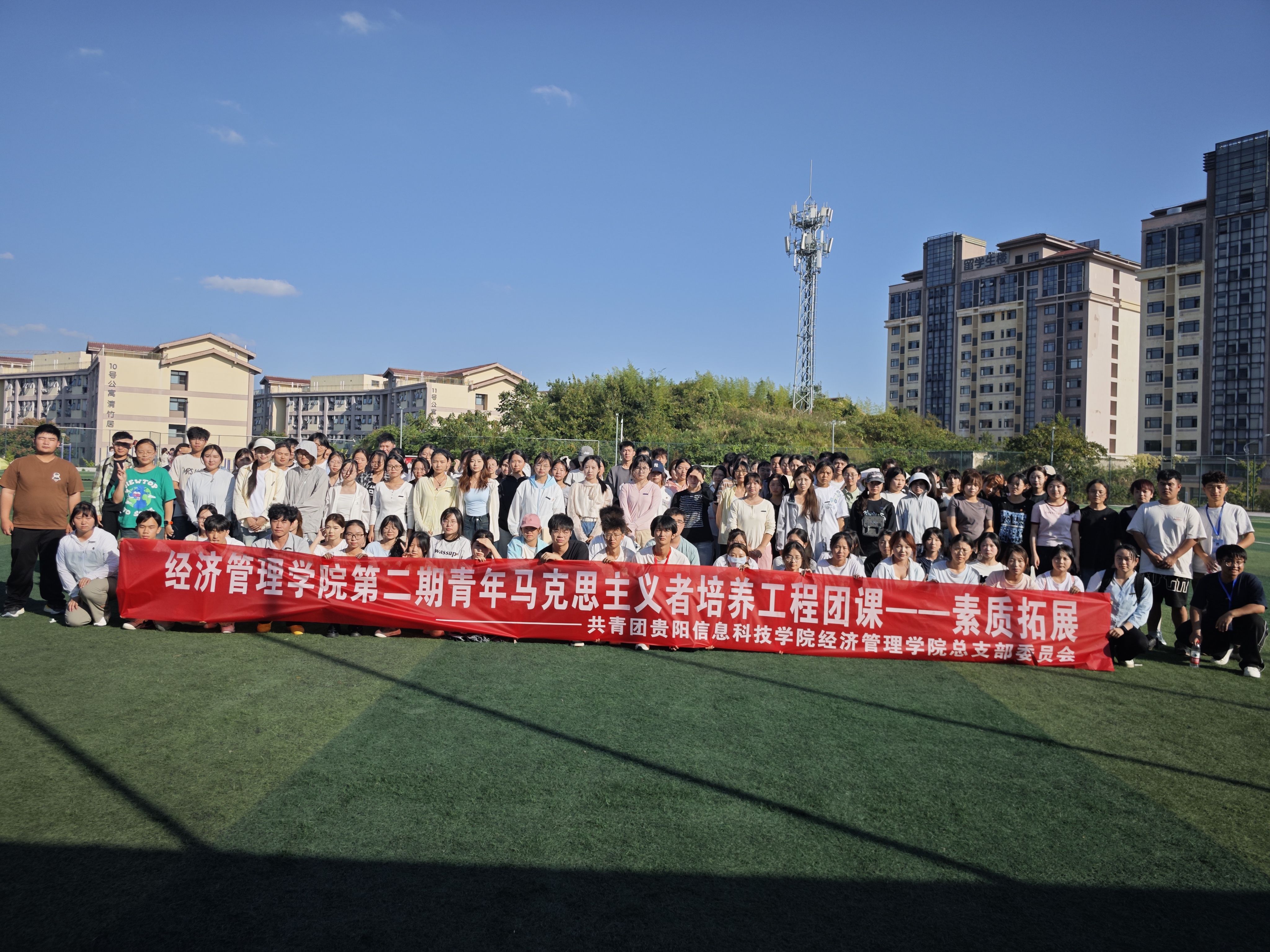 2025年10月12日,素质拓展专场在二号足球场温情启幕,以“协作”为钥,解锁青春活力。“背对背传气球猜歌名” 环节里,团员两两结对,气球在默契传递中轻舞,熟悉旋律响起时,抢答声此起彼伏,现场欢歌与掌声交织成热闹图景;接续的艺演环节,同学们轮番登台,嘹亮歌声唱响时代强音,动感舞姿绽放青春芳华,在欢声笑语中,既增进了同窗情谊,又锻造了团队协作能力。