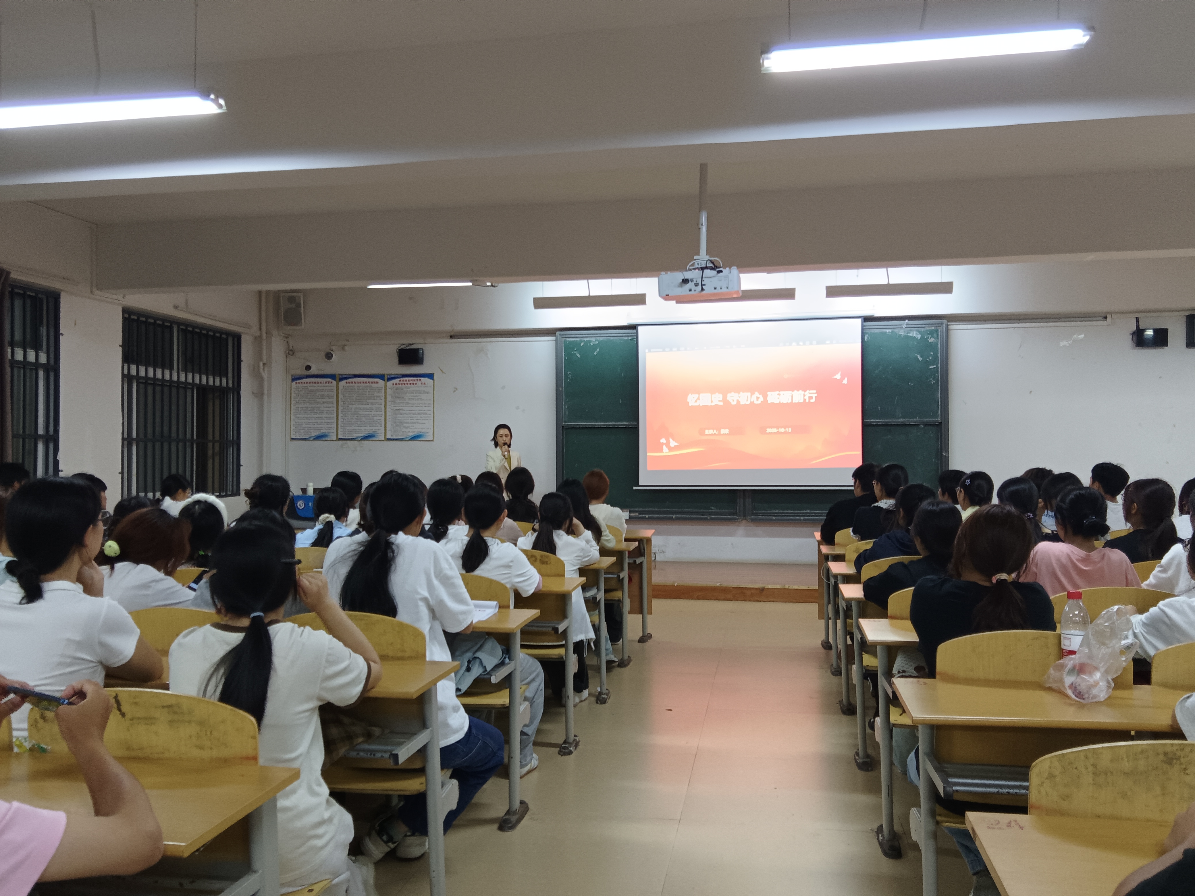 2025年10月13日,颜欣老师在B209教室开展“忆团史・守初心・砺前行”专题团课。课上,她以时间为轴,梳理共青团从五四运动时期的青春呐喊到新时代的使命赓续,让红色基因融入血脉;还展播新中国成立以来科技、经济、民生领域的成就,点燃团员的民族自豪感与家国情怀,为青年注入前行力量。