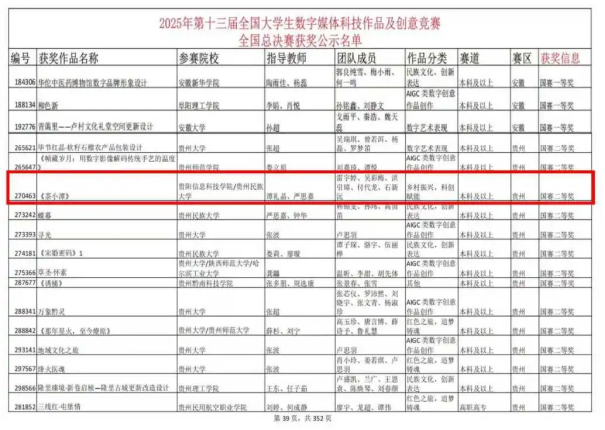 近日,2025年第十三届全国大学生数字媒体科技作品及创意竞赛全国现场总决赛在哈尔滨圆满落幕。beat365谭礼晶老师带领以雷宇婷,洪引璋,吴彩梅等几位同学组成的参赛团队一路披荆斩棘,从校赛突围、省赛角逐,最终站上全国总决赛舞台,凭借过硬的专业实力与创新创意,成功斩获全国二等奖。备赛与参赛期间,肖兴老师全程履行带队职责,保障学生出行安全;数字传媒学院多名专业教师亦深度参与指导,从专业维度为团队赋能,共同助力其稳步晋级。