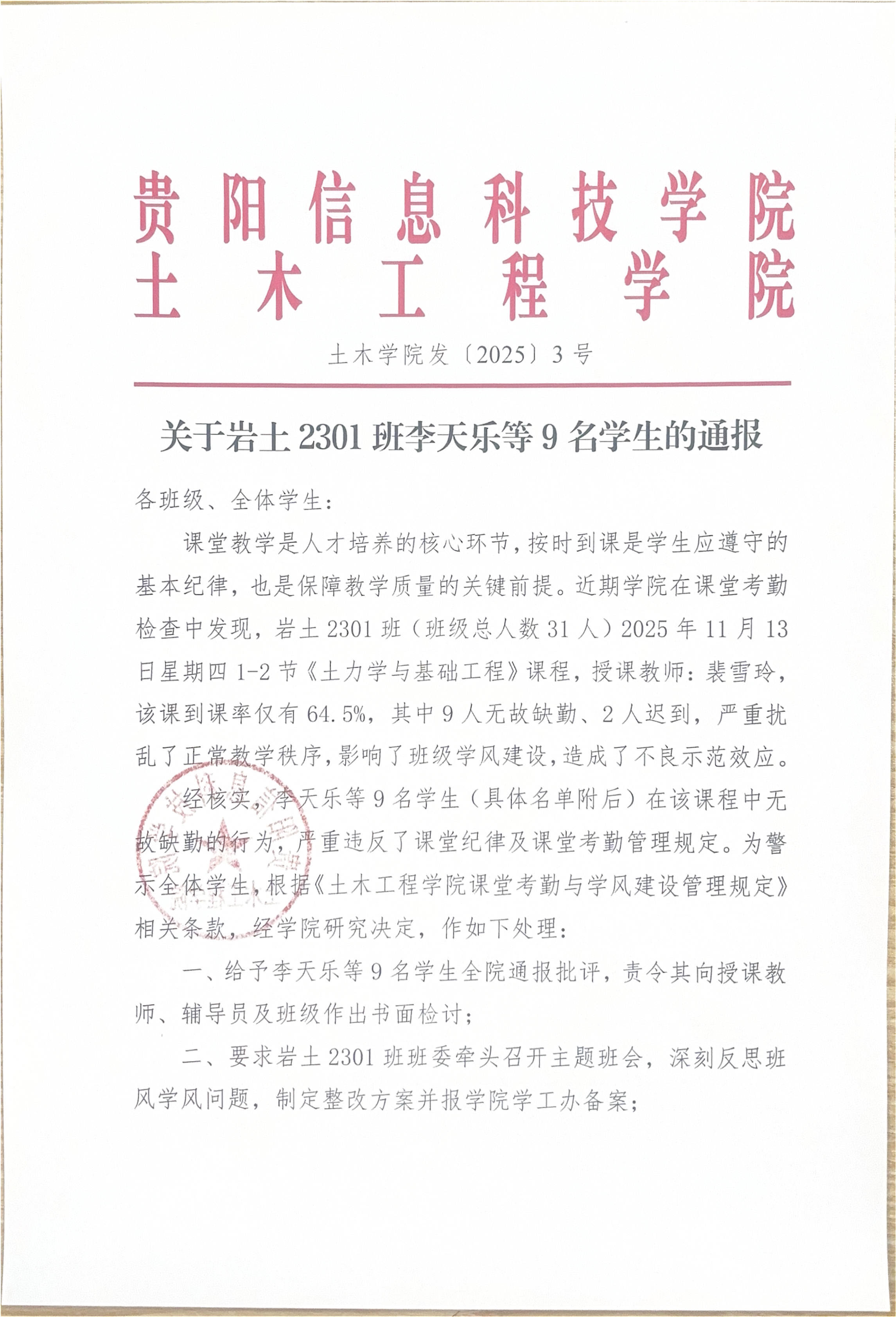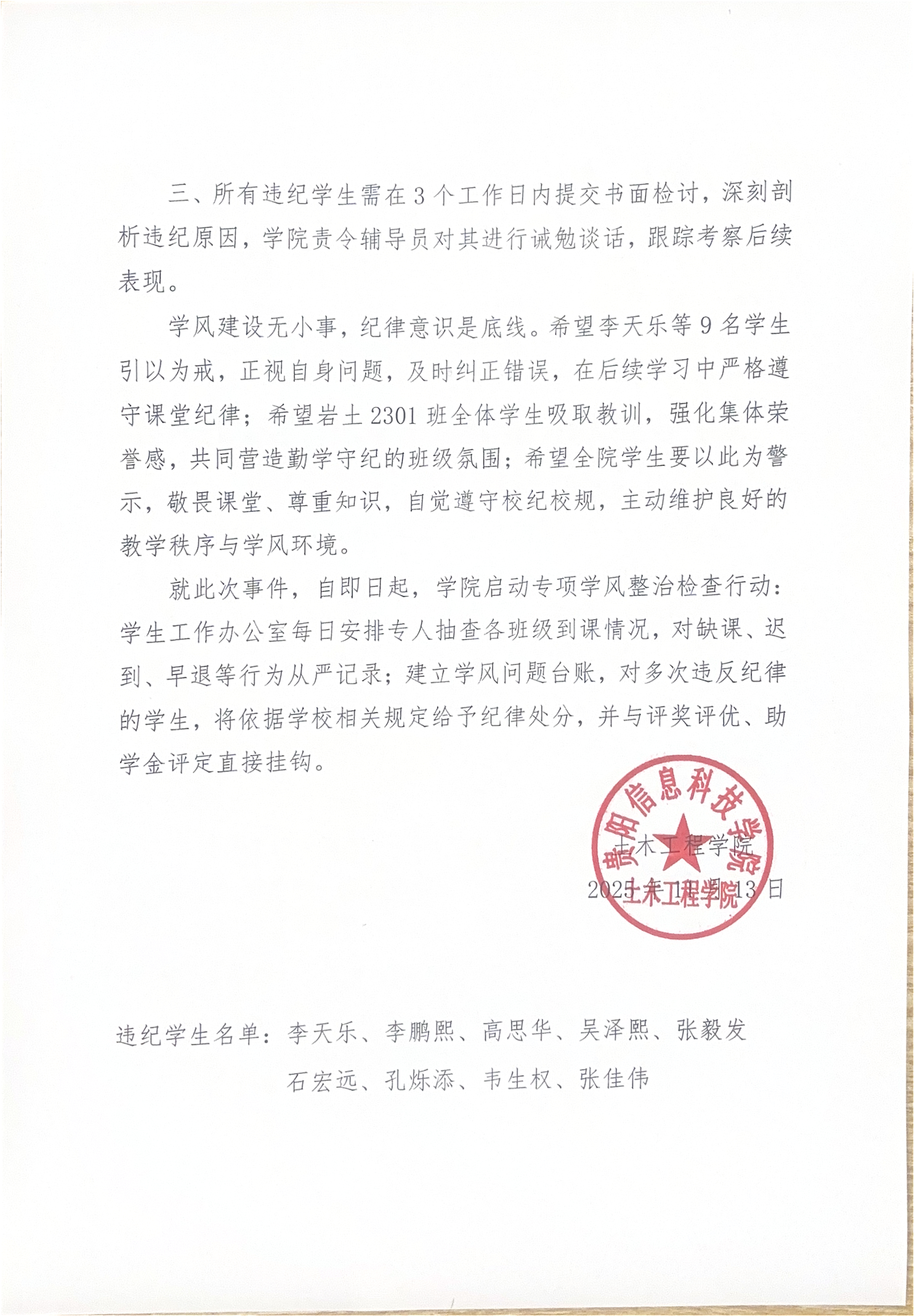 beat365在线唯一官网土木工程学院关于岩土2301班李天乐等9名学生的通报