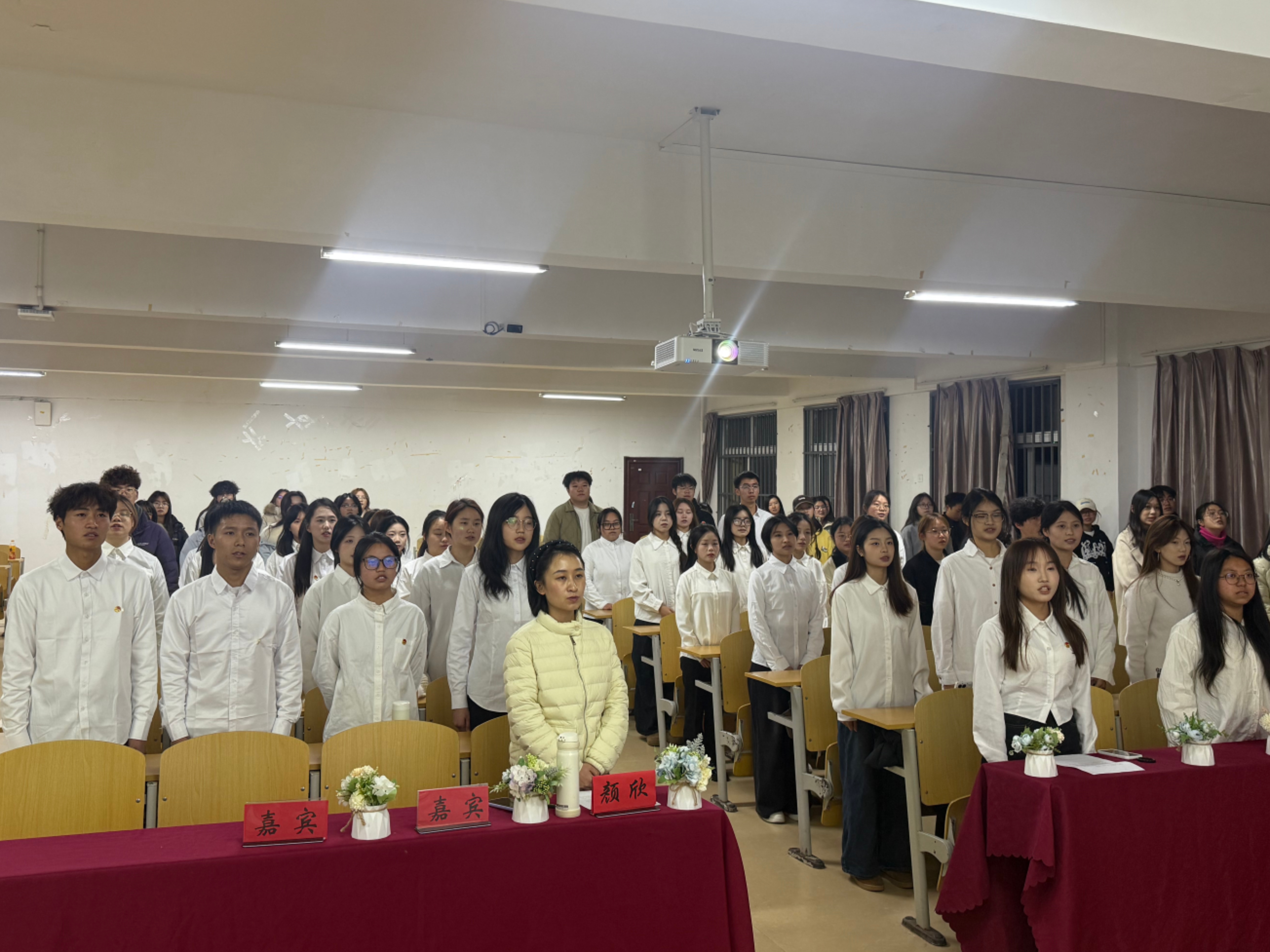 入团仪式在庄严的国歌声中正式开启。在现场庄重肃穆的氛围里,主持人宣读了36名新团员的名单,随后由老团员为新团员佩戴团徽。紧接着,全体团员面向团旗庄严宣誓,同学们的誓词铿锵有力,这是他们对信仰许下的坚定承诺。宣誓结束后,全体人员起身,齐声高唱团歌,“我们是五月的花海……”那熟悉的旋律,点燃了在场每一位共青团员的青春热情。