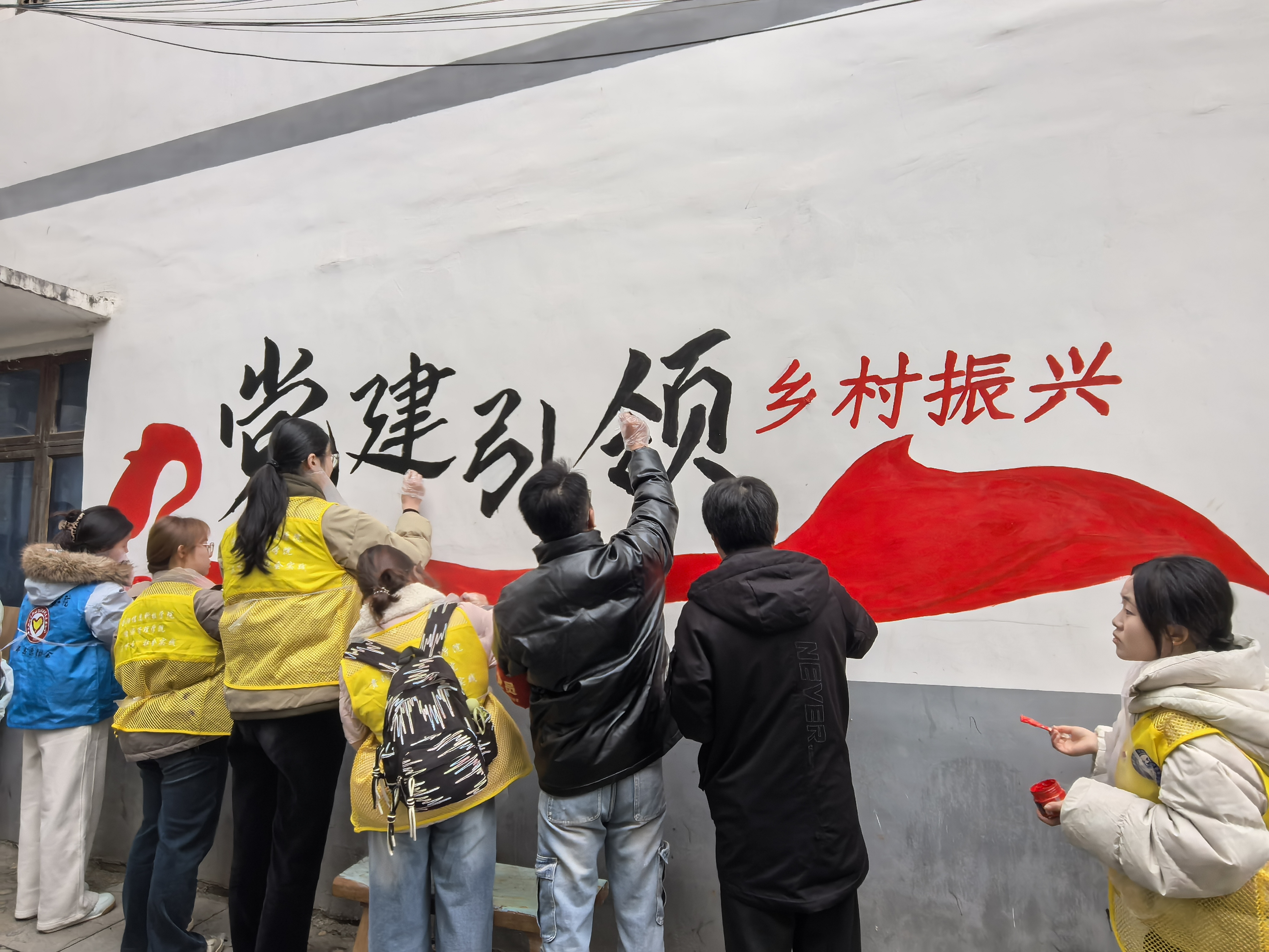 在龙井村主干道旁,学院师生与村民共同开展“党建引领·乡村振兴”主题墙绘创作。墙绘融合党的二十大精神与地方特色文化,展现田园风光与民族风貌。党团员带头调色勾线,村民积极参与绘制,原本单调的墙面焕然一新,成为传播文明理念、凝聚乡风文明的重要载体。