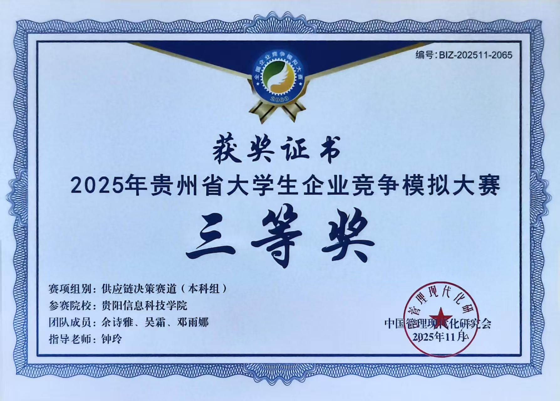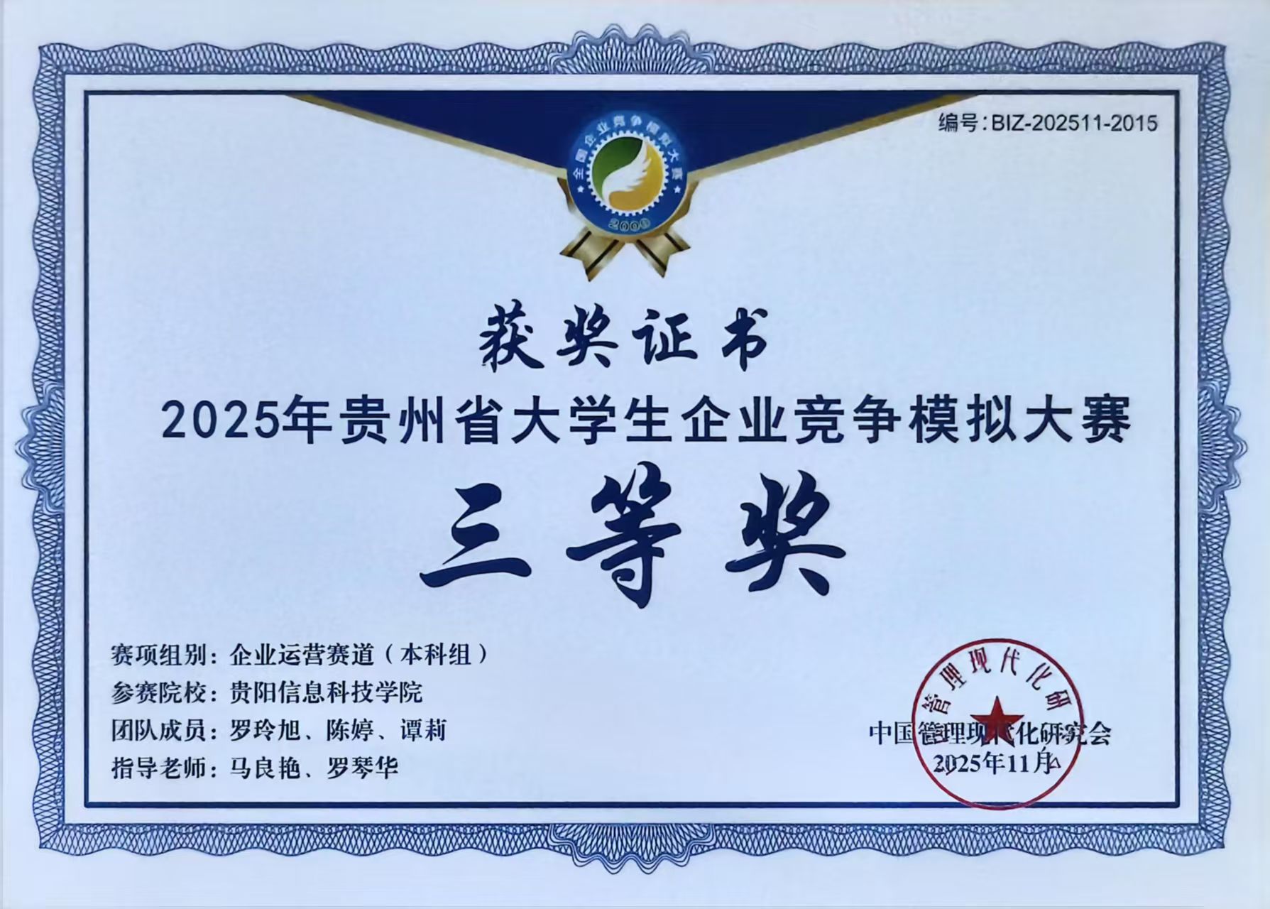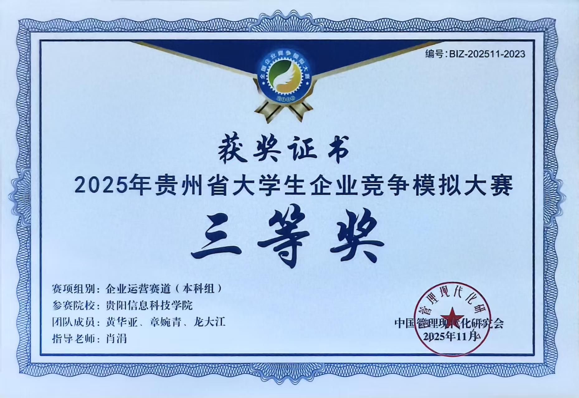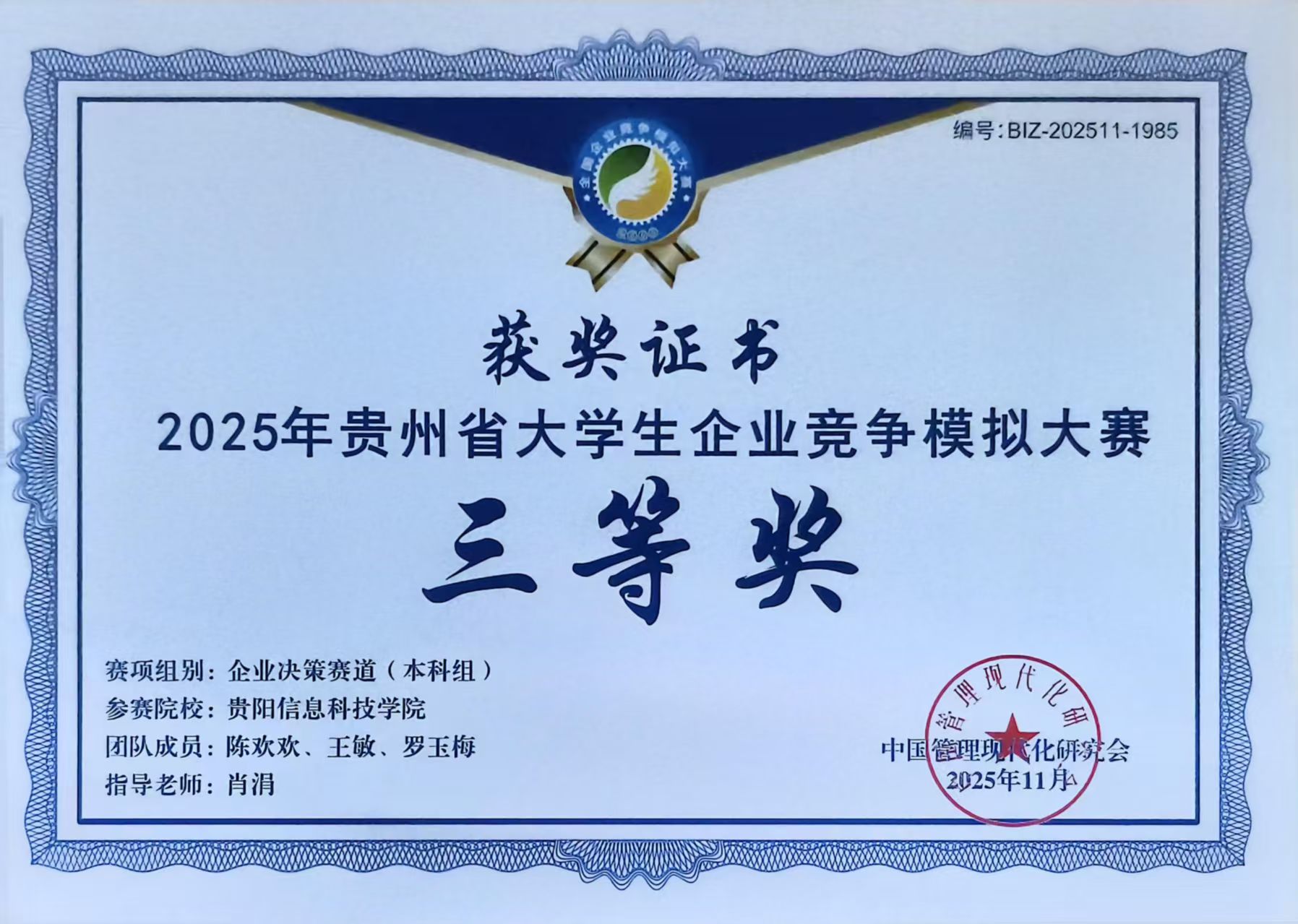 新闻网讯(供稿/供图 经济管理学院)2025年11月28日,2025年贵州省高校企业竞争模拟大赛决赛结果正式揭晓。beat365在线唯一官网经济管理学院参赛学子凭借扎实的专业知识、出色的分析决策能力和高效的团队协作精神,在全省多所高校优秀团队的激烈竞争中脱颖而出,五支参赛队伍全部荣获省级三等奖,充分展现了学校在应用型人才培养与实践教学方面的扎实成效。