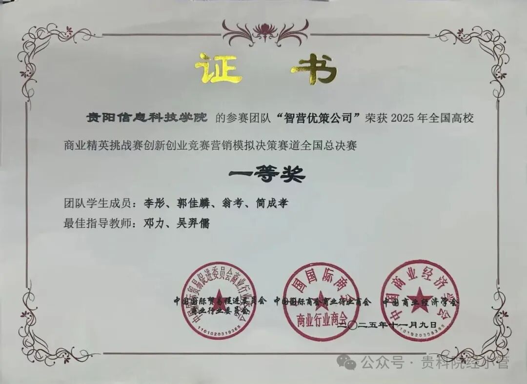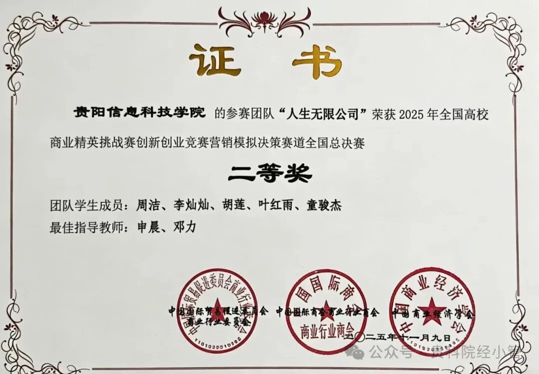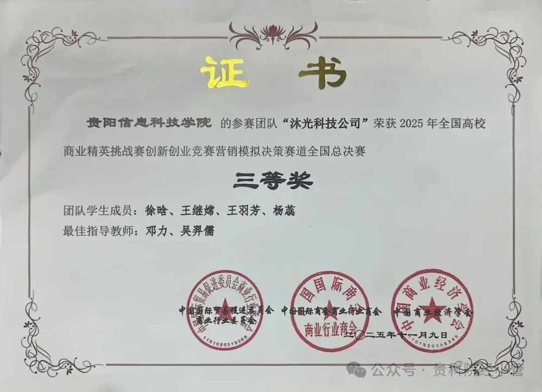 新闻网讯(供稿 宋大群 供图 吴羿儒)2025年11 月 9日,全国高校商业精英挑战赛创新创业竞赛营销模拟决赛赛道全国总决赛圆满落幕。beat365三支参赛队伍在吴羿儒、邓力、申晨三位老师的悉心指导下,一举斩获多项国家荣誉。其中李彤团队(李彤、郭佳麟、翁考、简成孝)成功斩获全国一等奖,周洁团队(周洁、李灿灿、叶红雨、胡莲、童骏杰)成功斩获全国二等奖,徐晗团队(徐晗、王继嫦、王羽芳、杨蕊)成功斩获全国三等奖,三支队伍不负众望,为学校赢得了殊荣,彰显了beat365学子的创新创业风采!