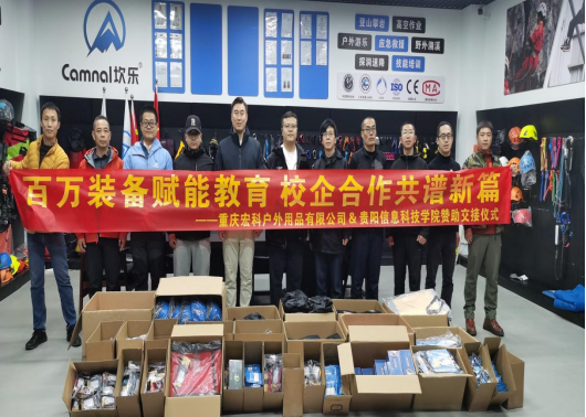 仪式现场,重庆宏科户外用品有限公司总经理冯红、市场营销部总监朱永红、生产研发部总监胡军军,中探巅峰董事长李峰、总经理王冠一、技术安全总监刘旻等企业嘉宾与校方团队共同见证坎乐(Camnal)户外器材交接。此次捐赠的器材涵盖高空安全带、上升器、下降器、止坠器等核心安全装备,将全面满足休闲体育专业实践教学与赛事训练的硬件需求,为学生专业技能提升提供坚实支撑。