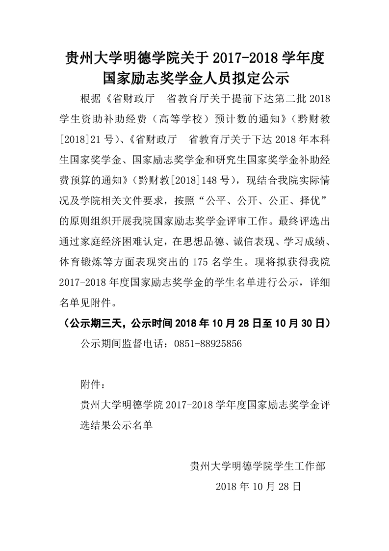 贵州大学明德学院关于2017-2018学年度国家励志奖学金人员拟定公示
