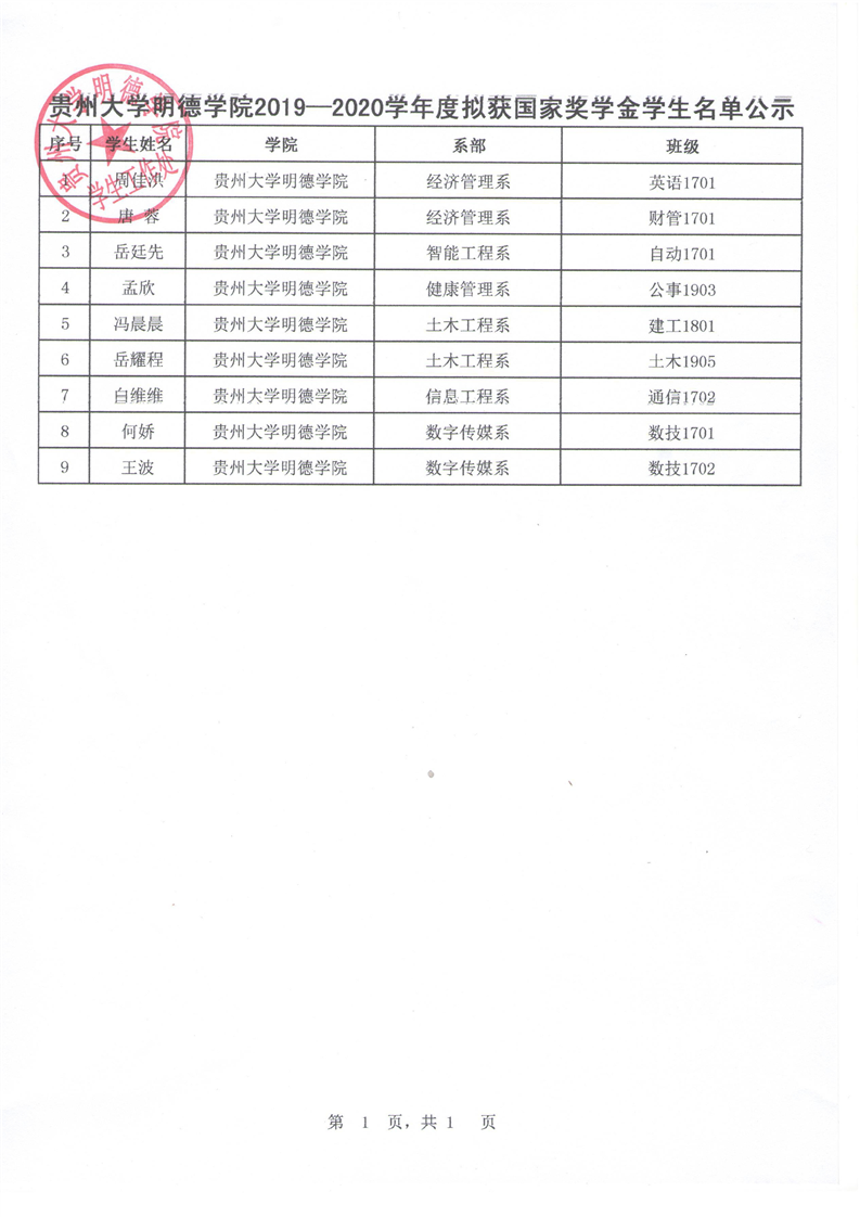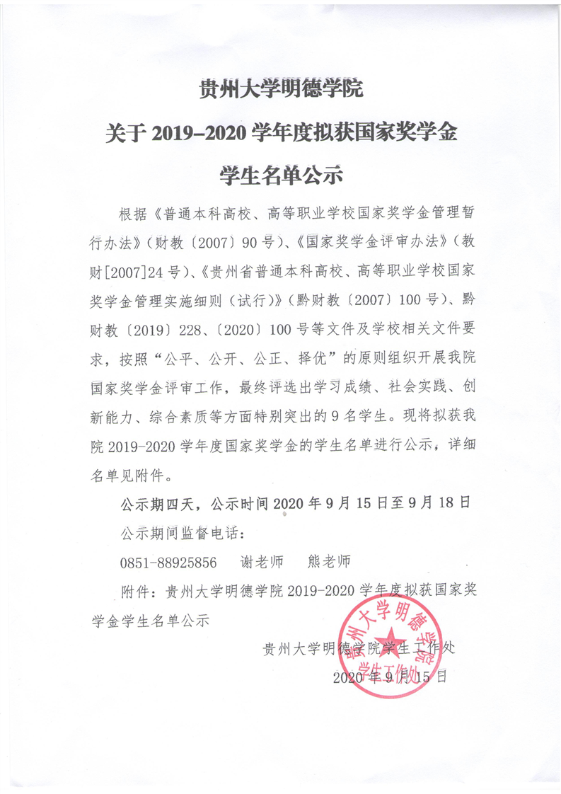 贵州大学明德学院关于2019—2020学年度拟获国家奖学金学生名单公示