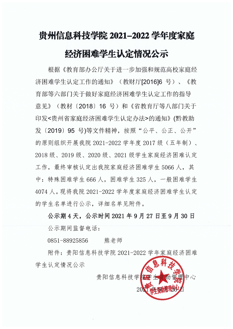 贵州信息科技学院2021-2022学年度家庭经济困难学生认定情况公示