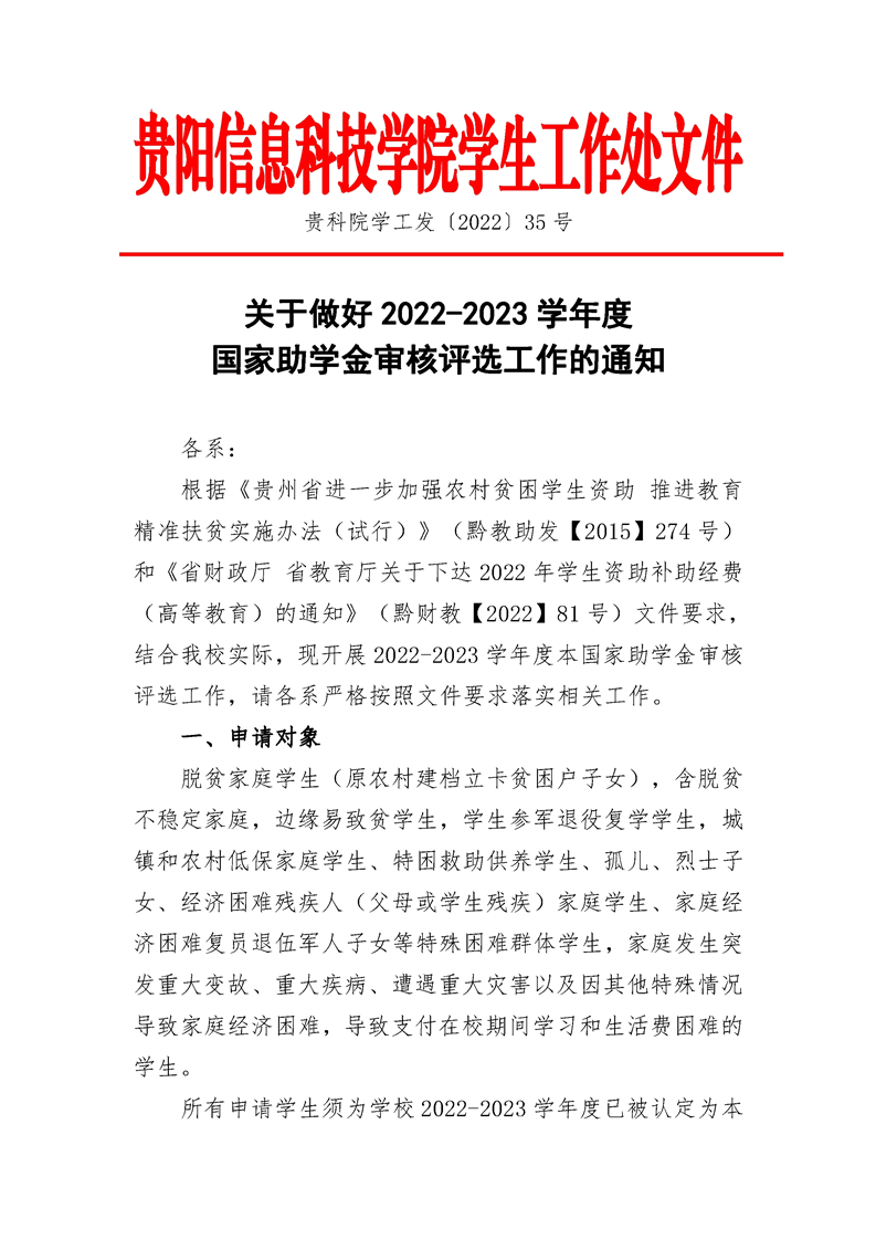 【贵科院学工发〔2022〕35号】关于做好2022-2023学年度国家助学金审核评选工作的通知.rar