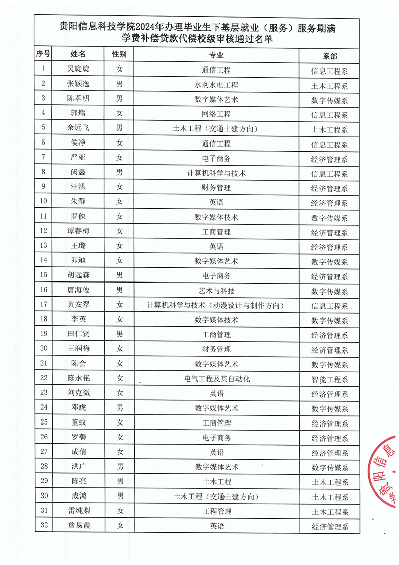 beat365在线唯一官网2024年毕业生下基层就业(服务)服务期满学费补偿贷款代偿校级审核通过名单公示