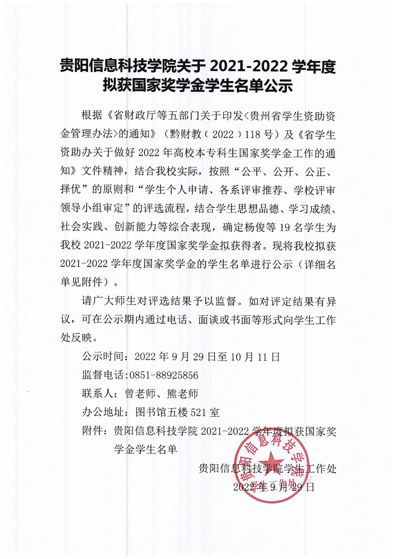 beat365在线唯一官网关于2021-2022学年度拟获国家奖学金学生名单公示