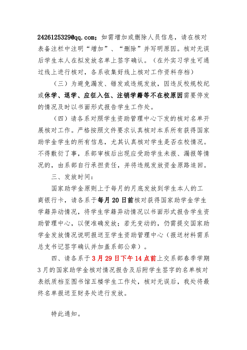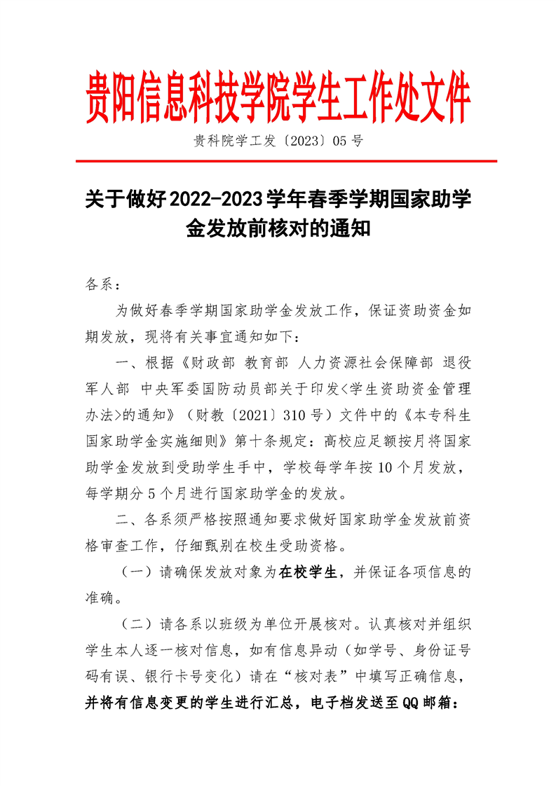 关于做好2022-2023学年春季学期国家助学金发放前核对工作的通知