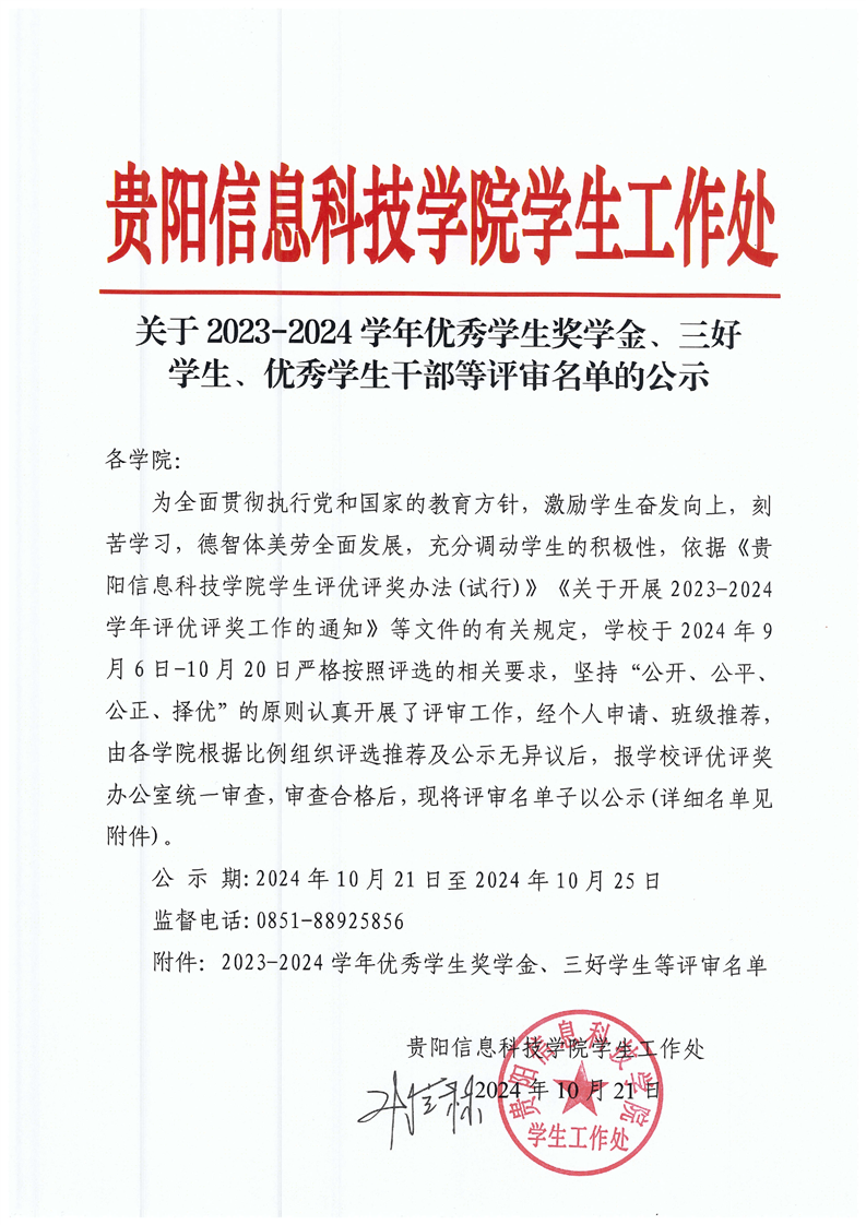 beat365在线唯一官网关于2024年贵州省普通高等学校三好学生、优秀学生干部、先进班集体拟推荐名单的公示