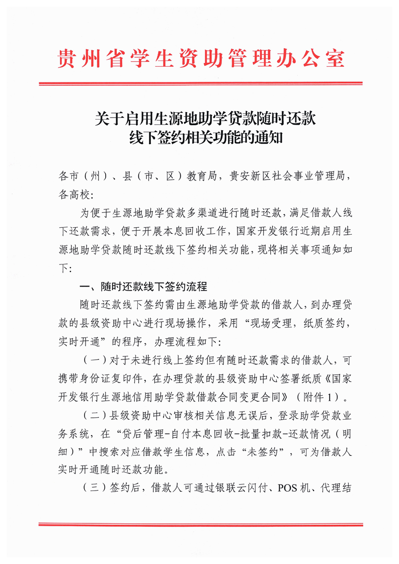关于启用生源地助学贷款随时还款线下签约相关功能的通知