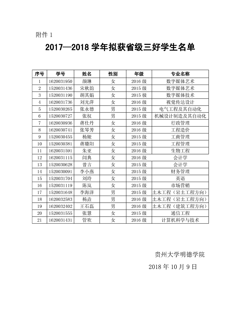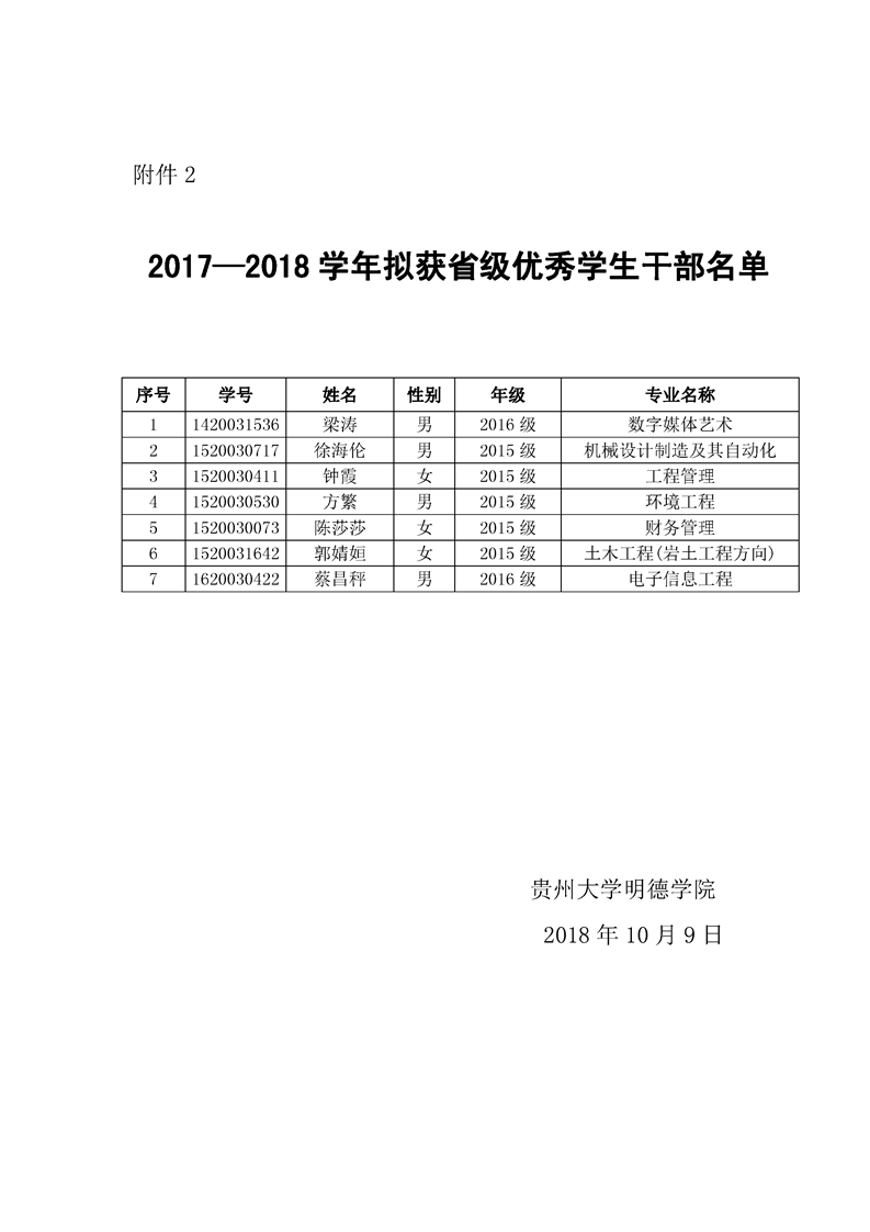 贵州大学明德学院2018年贵州省普通高等学校三好学生、优秀学生干部、先进班集体公示
