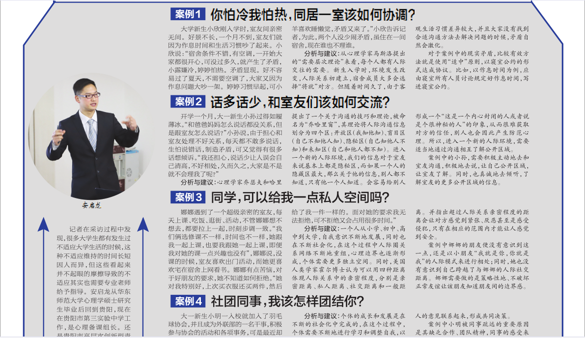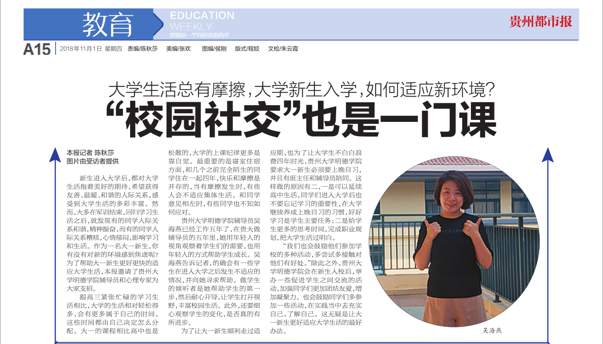 我院辅导员发表贵州都市报文章:“校园社交”也是一门课——大学生活总有摩擦,大学新生入学,如何适应新环境?