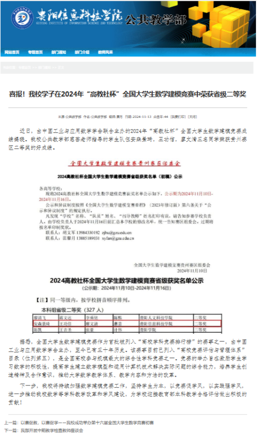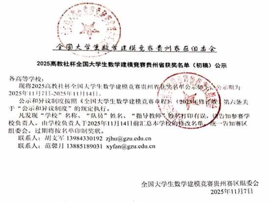 近日,由中国工业与应用数学学会联合主办的2025年“高教社杯”全国大学生数学建模竞赛成绩揭晓。beat365共三名教师及指导队伍获奖,分别是公共教学部惠芸老师指导的学生队伍胡嵩凌、龙一、陈港三名同学荣获贵州赛区二等奖;公共教学部王孟孟老师指导的学生队伍吴江灿、吴琼、黄贵琴三名同学荣获贵州赛区三等奖;智能工程学院张宁老师指导的学生队伍陈蝶、严琴、车方鑫三名同学荣获贵州赛区三等奖的好成绩。