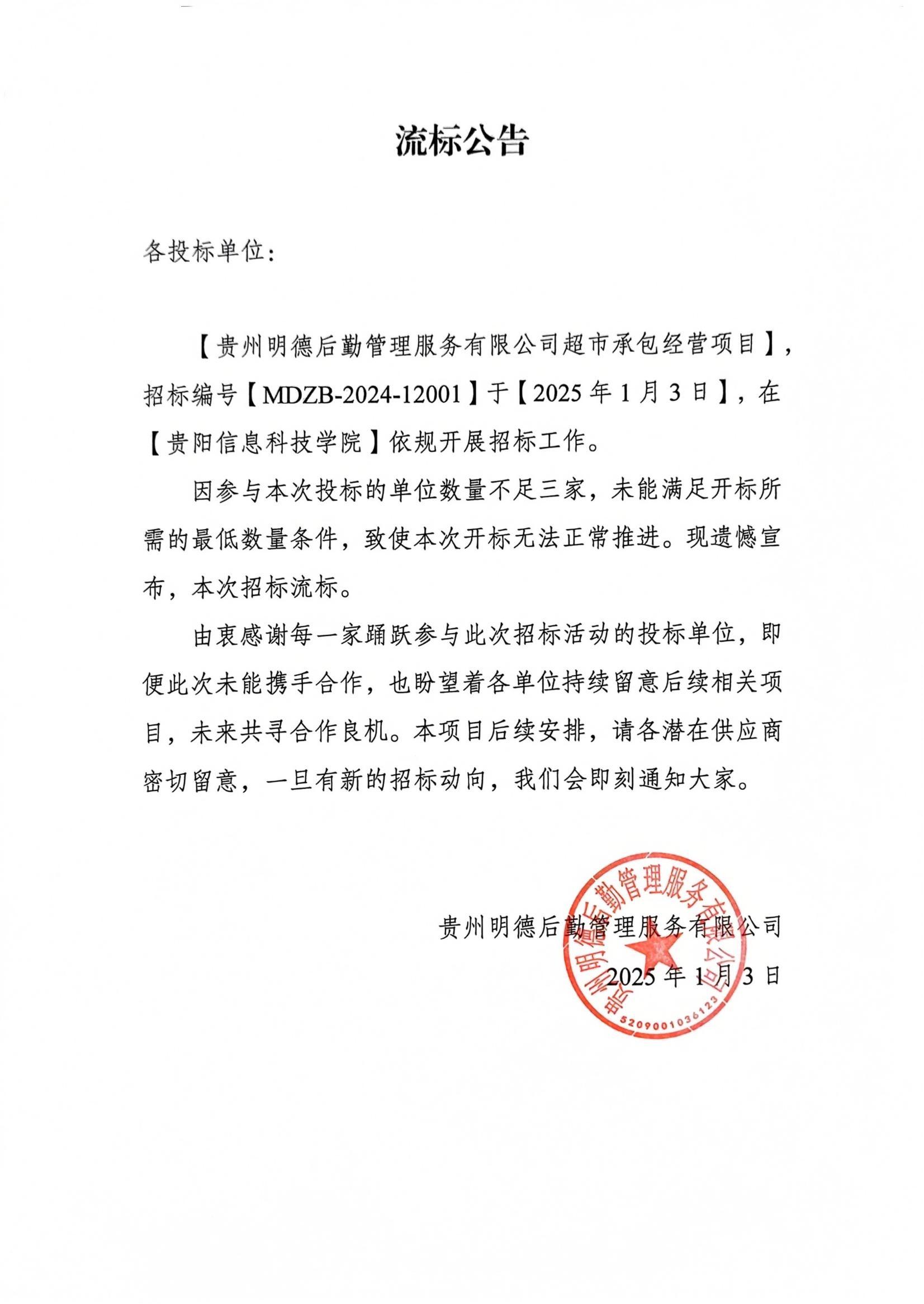 贵州明德后勤管理服务有限公司超市承包经营项目流标公告