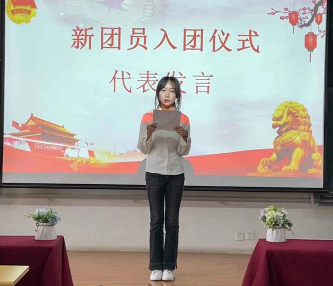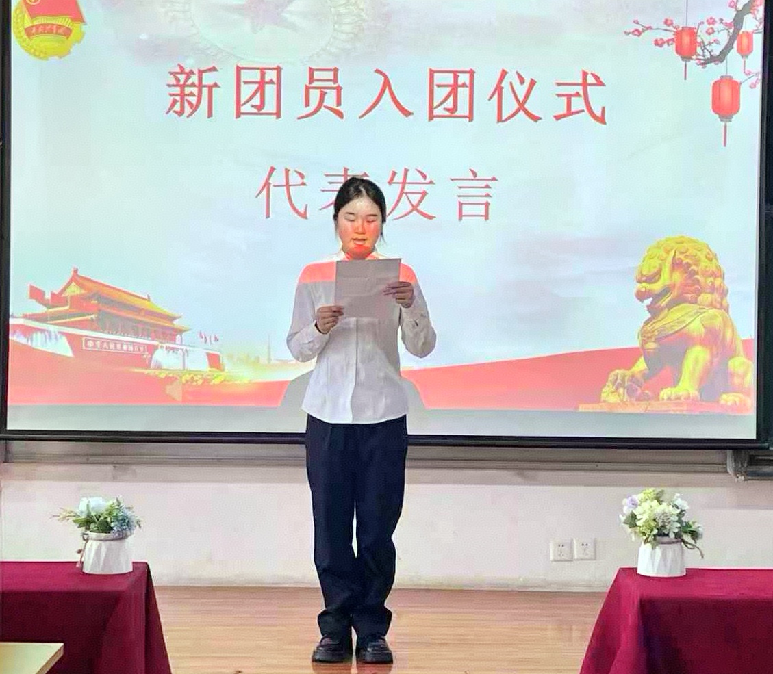 仪式上,新团员代表董苏成登台发言,她眼中闪烁着激动与自豪的光芒。她表示,当团徽别在胸前,庄严宣誓的那一刻,深切感受到了共青团员这一身份的光荣与神圣。“从今天起,我们不仅是父母眼中的孩子,更是肩负使命的共青团员。”她坚定地说,“我们将以团员的标准严格要求自己,在学习中勤奋刻苦,在生活中团结同学,积极参与社会实践,主动承担社会责任。以实际行动践行入团誓言,让青春在为祖国、为人民的奉献中焕发出更加绚丽的光彩!”