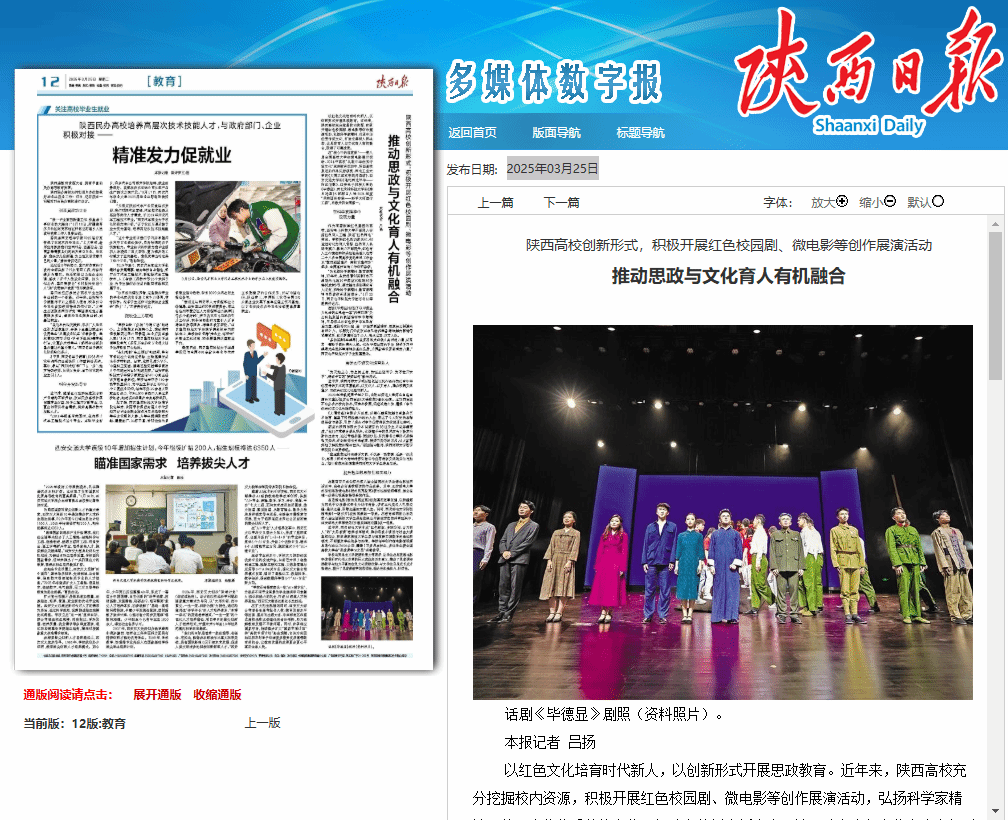 师大新闻网讯3月25日,《陕西日报》在题为《陕西高校创新形式,积极开展红色校园剧、微电影等创作展演活动 推动思政与文化育人有机融合》的报道中,对伟德官网将原创校园文化作品作为传承中华优秀传统文化的重要载体,用优秀传统文化滋育新人情况进行了报道。